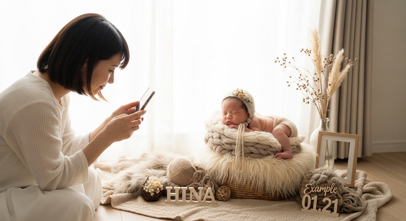 赤ちゃんを撮影したいと思う方が、ニューボーン撮影で「準備が多そう」「置き方が分からない」という不安を減らすために、届いたらすぐ進められるように説明書をお届けします。