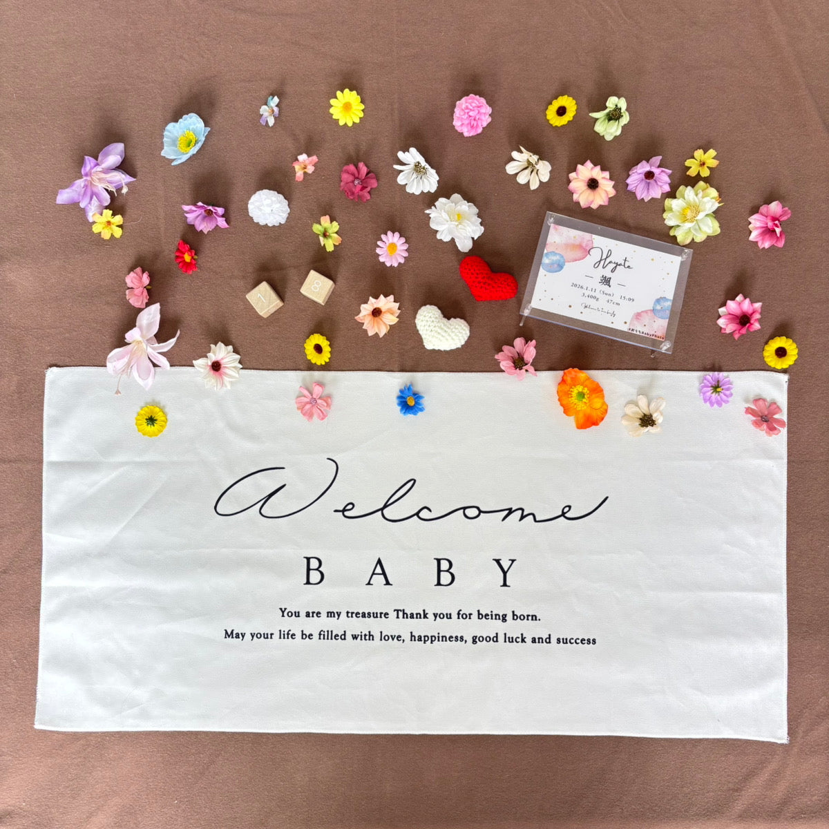 ブラウンの布を敷き、お花を散りばめるだけで、撮影の土台が完成します。