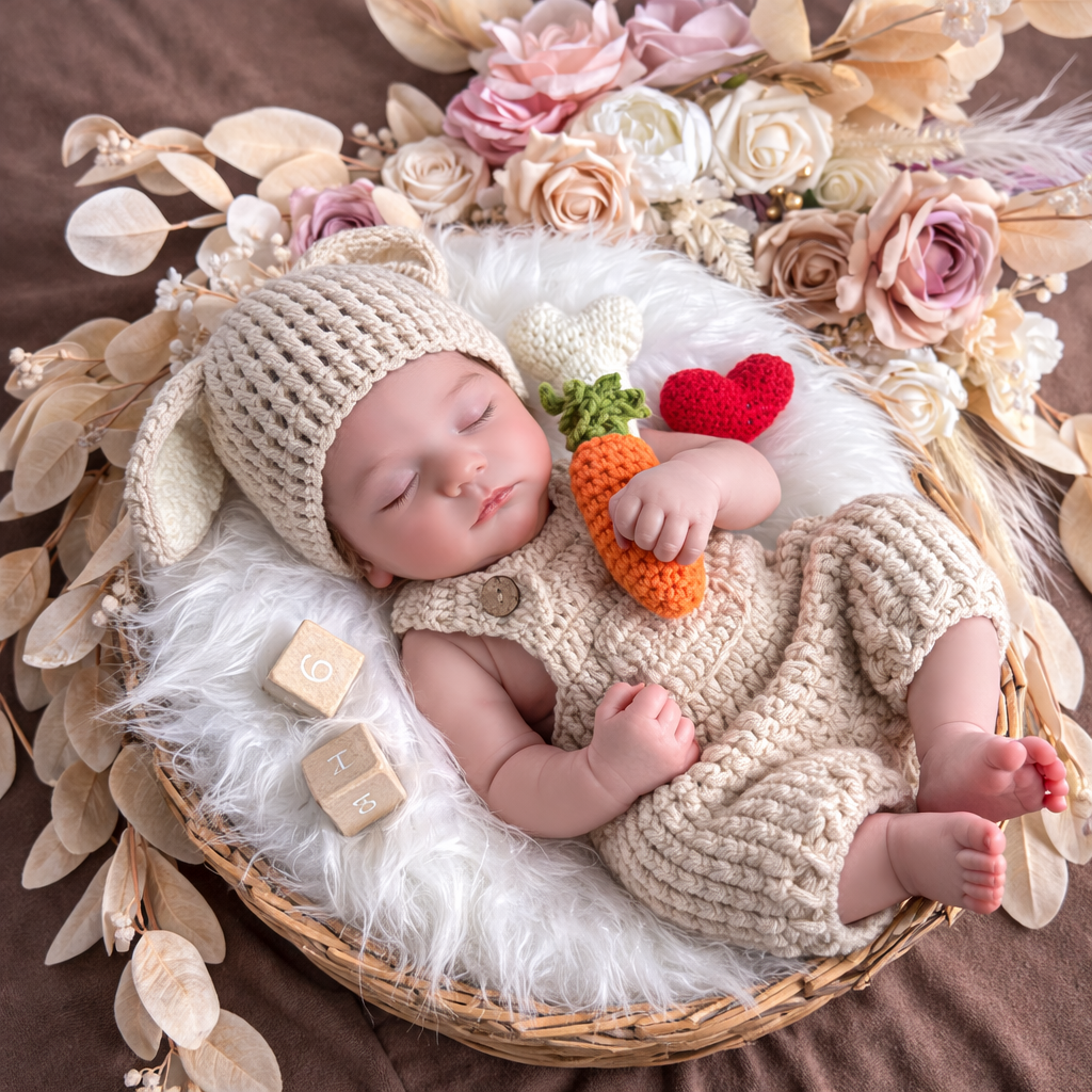 衣装を着せて赤ちゃんをそっと寝かせるだけで、