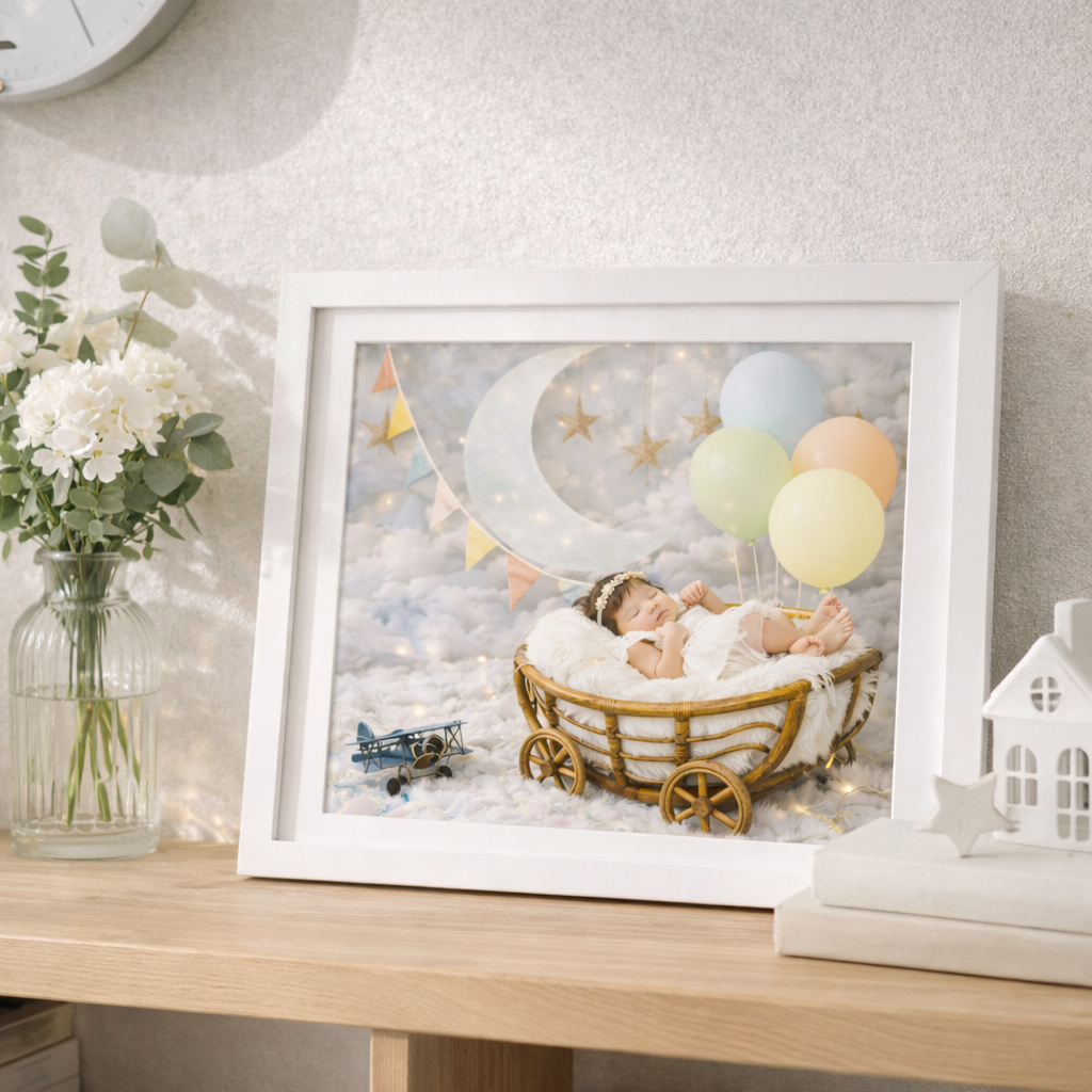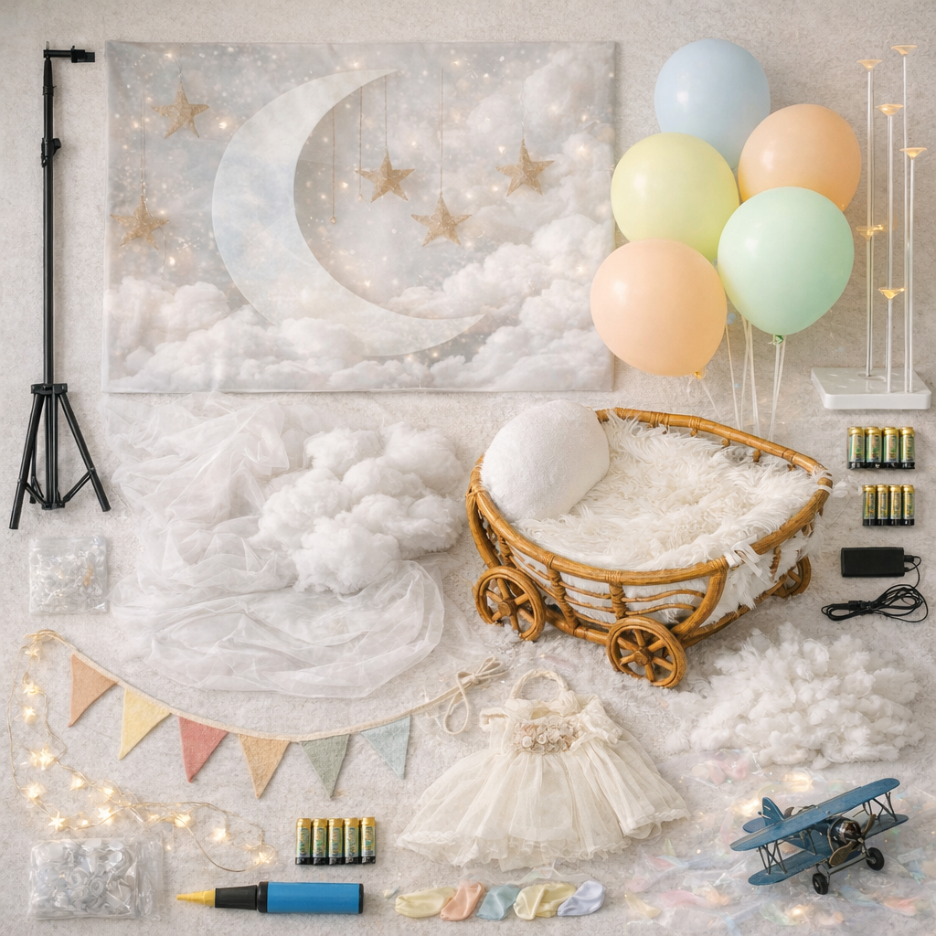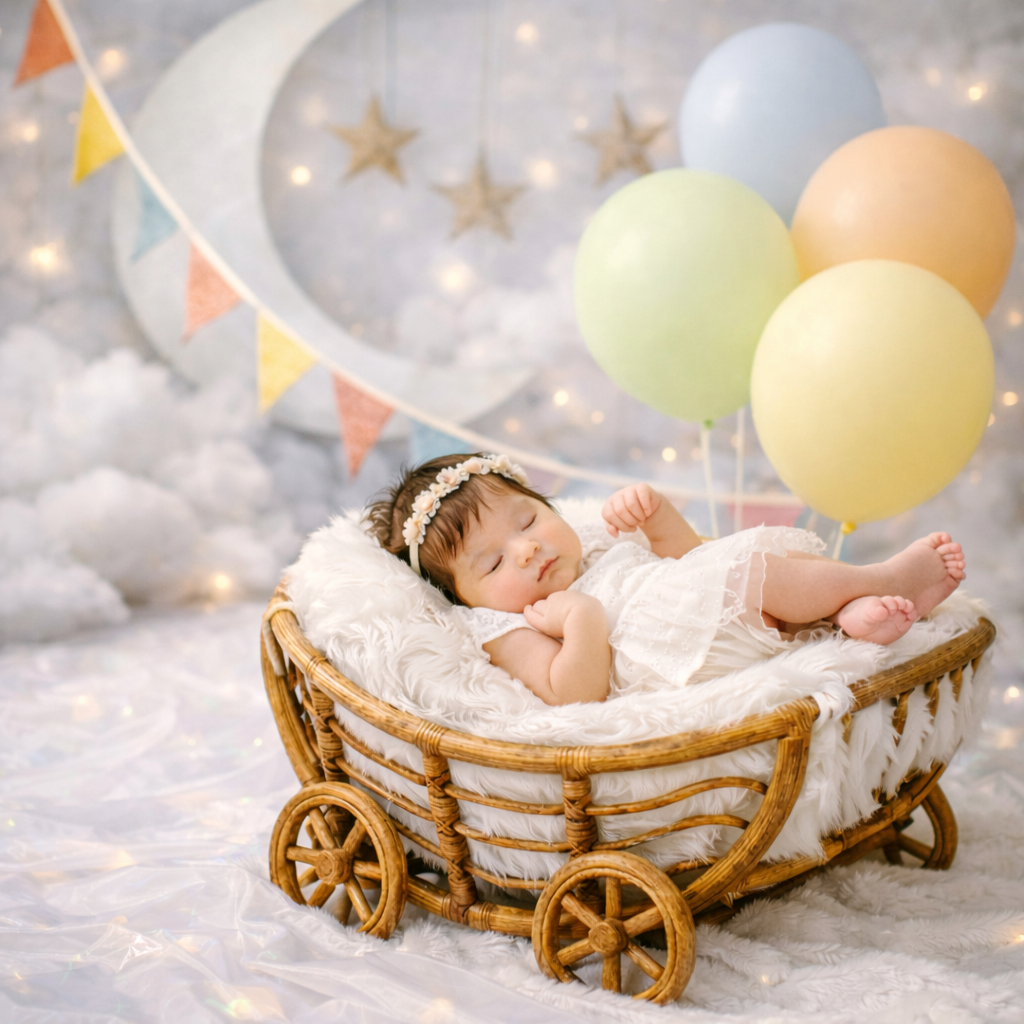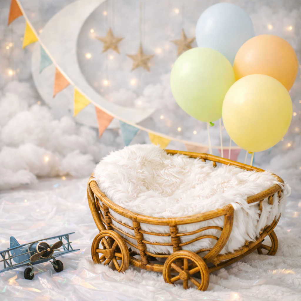 月と雲の背景に、パステルのバルーンが映えるニューボーン撮影セットです。ゴンドラのあたたかい雰囲気と白い布の組み合わせで、写真が明るくきれいにまとまります。