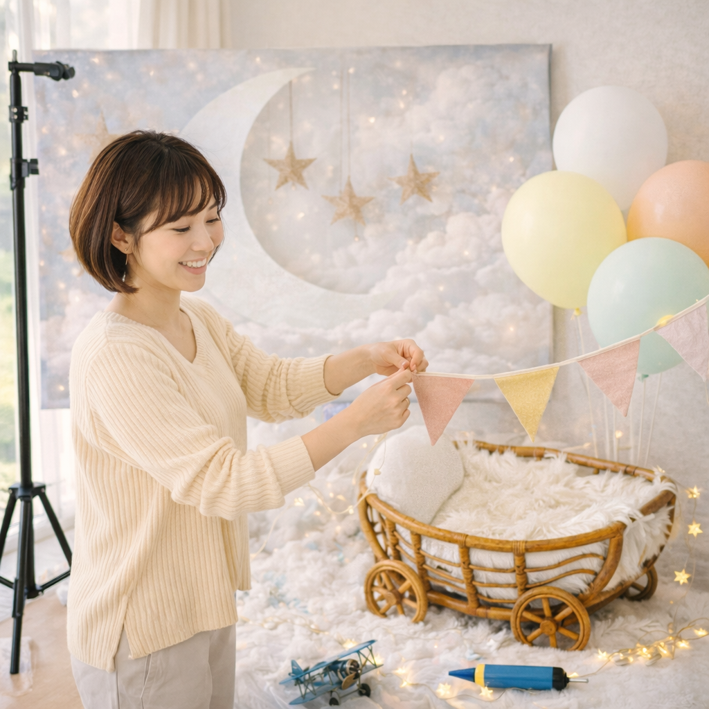背景がしっかりしているので、準備が短くても写真が寂しく見えにくいです。バルーンやライトで特別感も足せるので、誕生の記念写真として残しやすくなります。