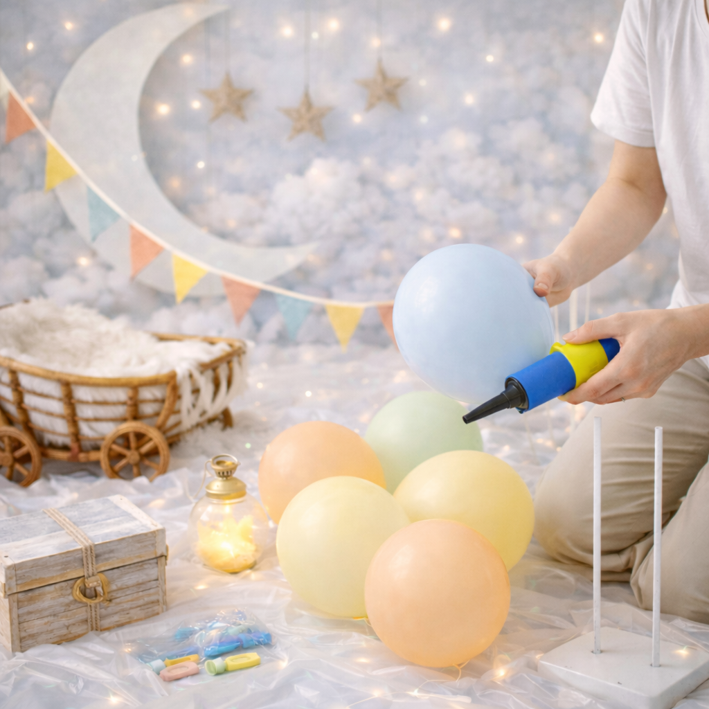 午前〜午後早めの自然光が入る窓ぎわが特におすすめです。白い布が光を拾い、バルーンの色もきれいに出ます。リビングの一角に背景を立てかけて撮れるので、特別な場所に行かなくても撮影できます。