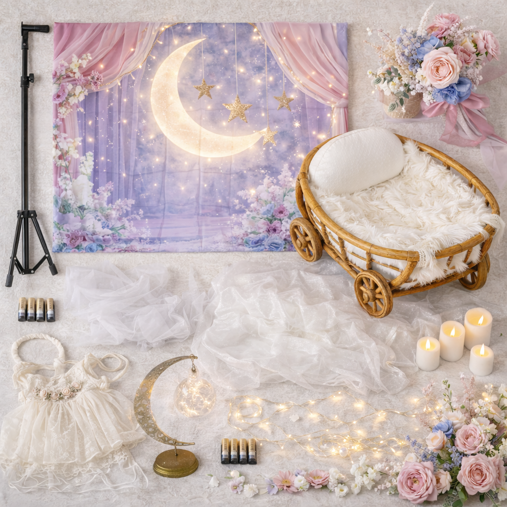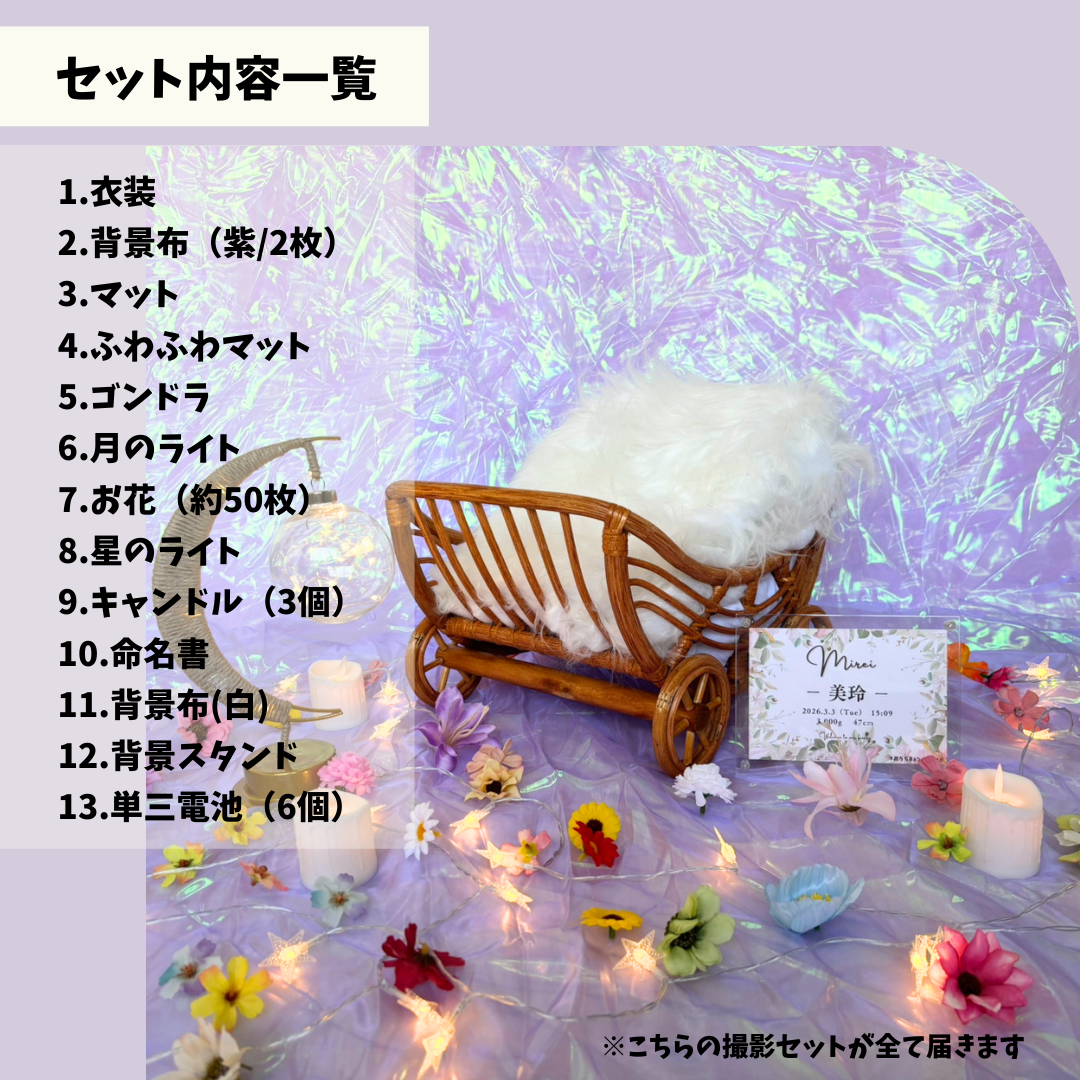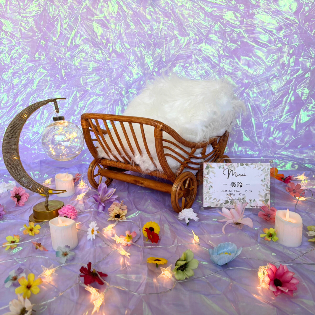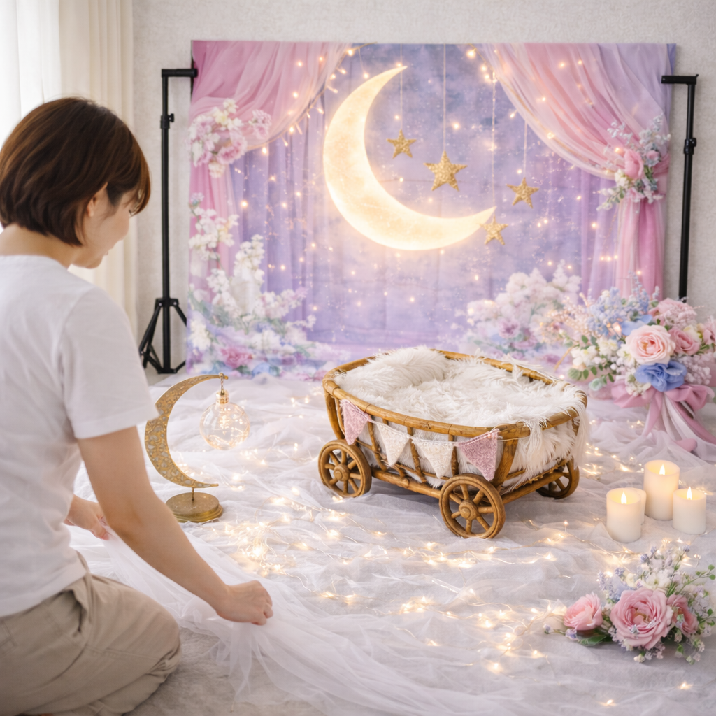 生まれてきてくれた大切な瞬間を、やさしい灯りの中で残すセットです。背景を立てて白い布を敷き、ゴンドラを置くだけで撮影の土台が整います。