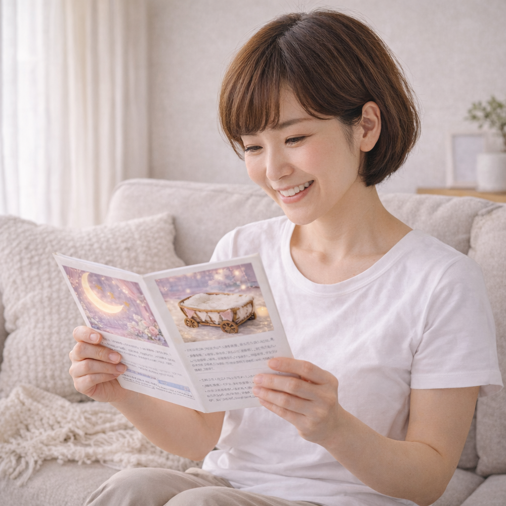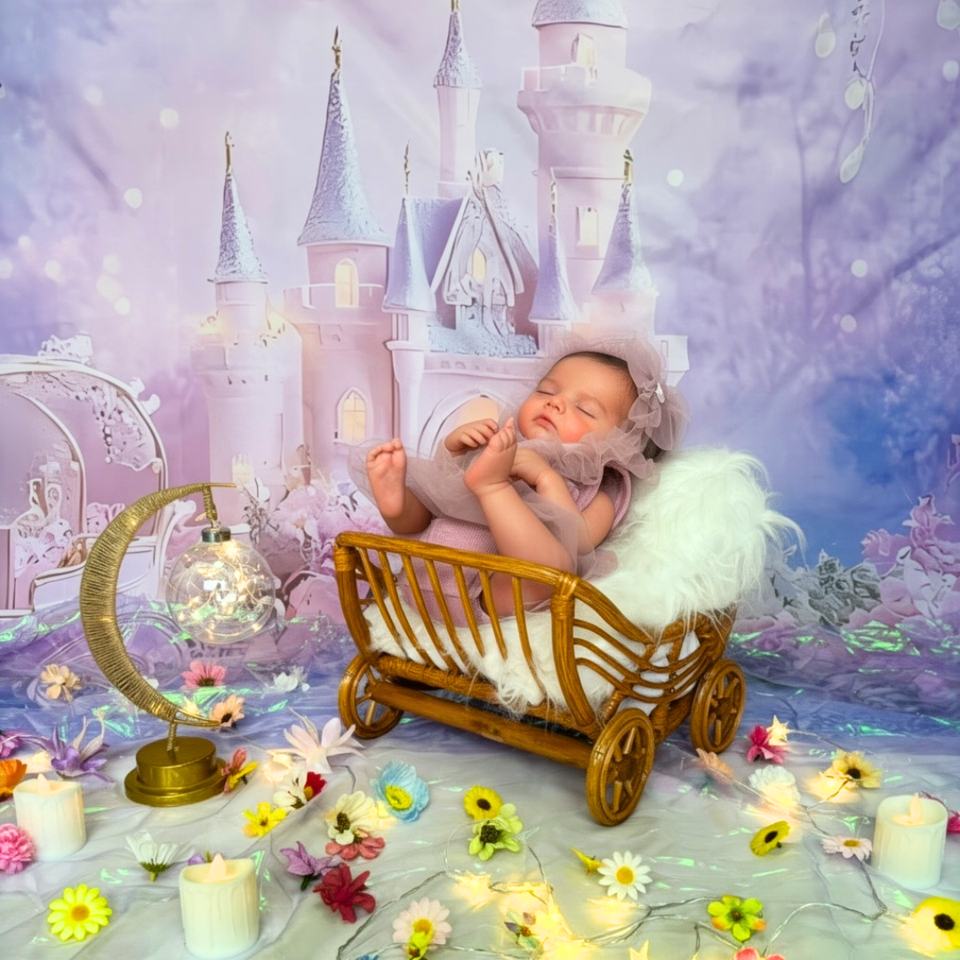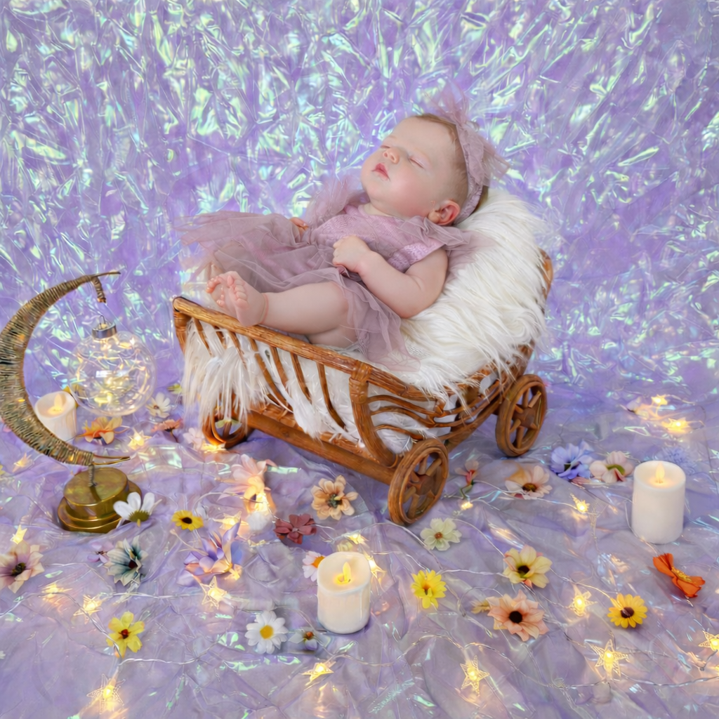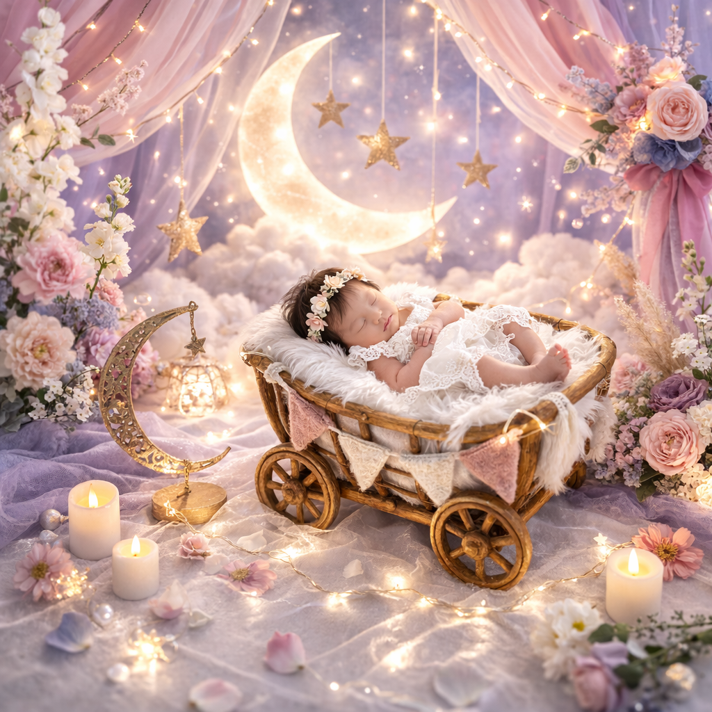 生まれてきてくれた大切な瞬間を、やさしい灯りの中で残すセットです。背景を立てて白い布を敷き、ゴンドラを置くだけで撮影の土台が整います。
