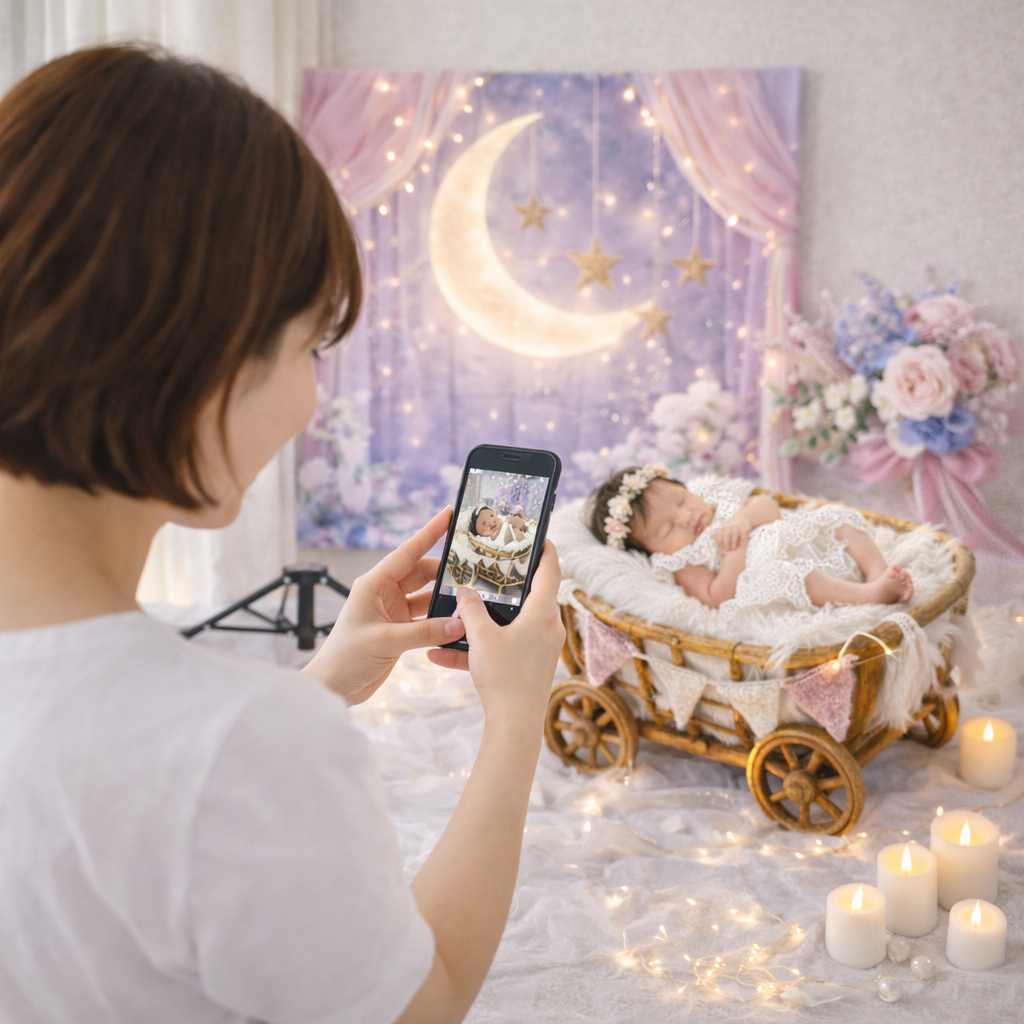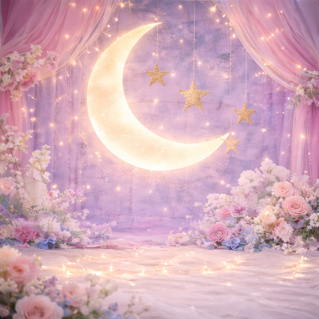 背景に月と星の世界観が入っているので、設置した時点で撮影らしさが出ます。紫〜ピンク系の色味が光を受けて、写真がやわらかく見えます。背景が整っていると、小物を盛りすぎなくても写真がまとまります。