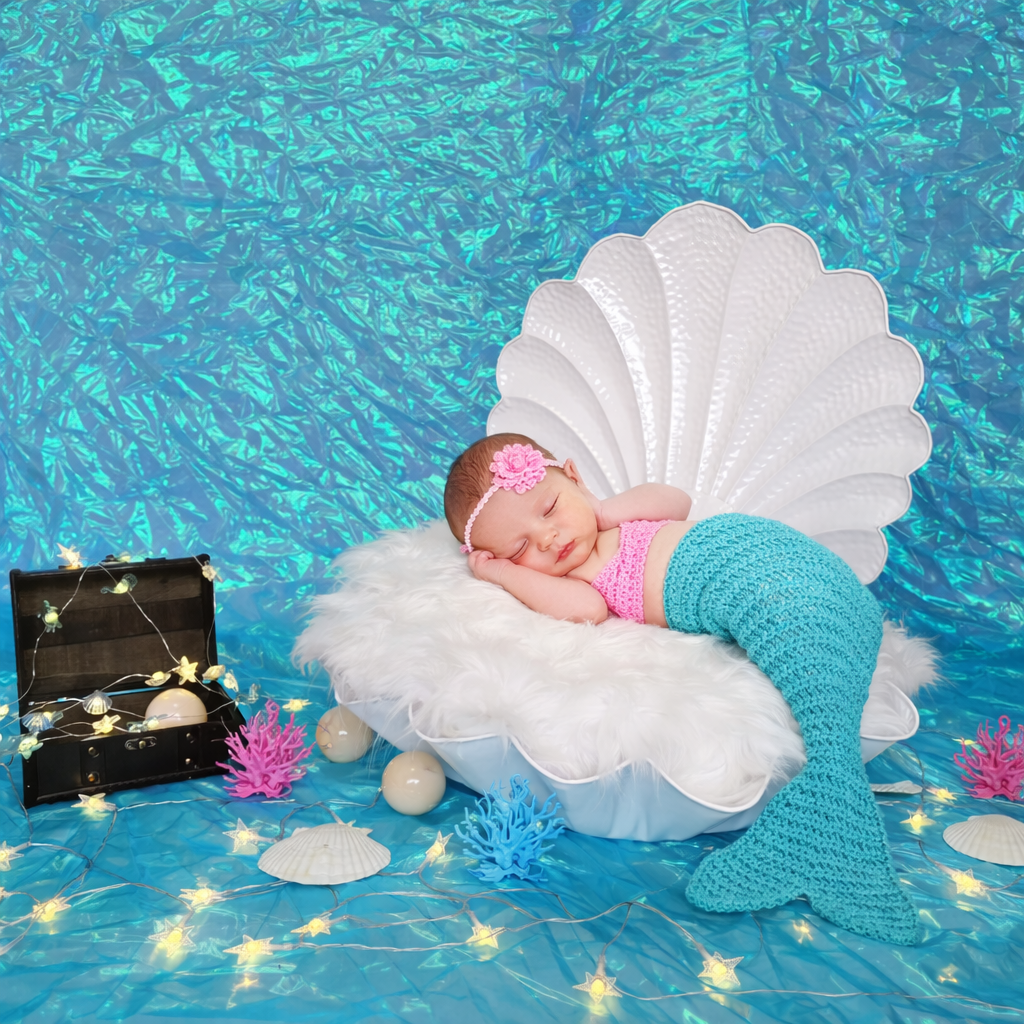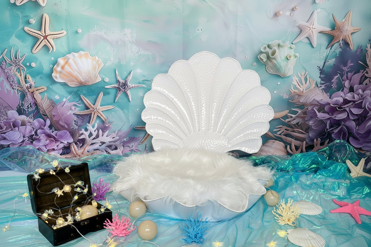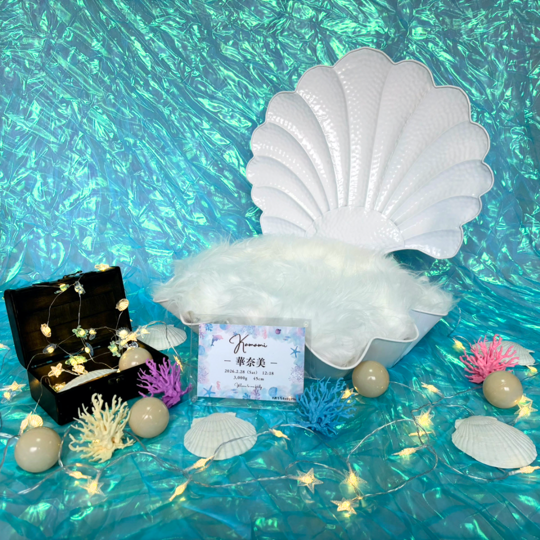 エメラルドグリーンと白の重なりが、ふっと息を吸いたくなるような透明感をつくります。貝殻ベッドの曲線が中心にあるだけで、写真全体が上品にまとまり、かわいさも自然に引き立ちます。